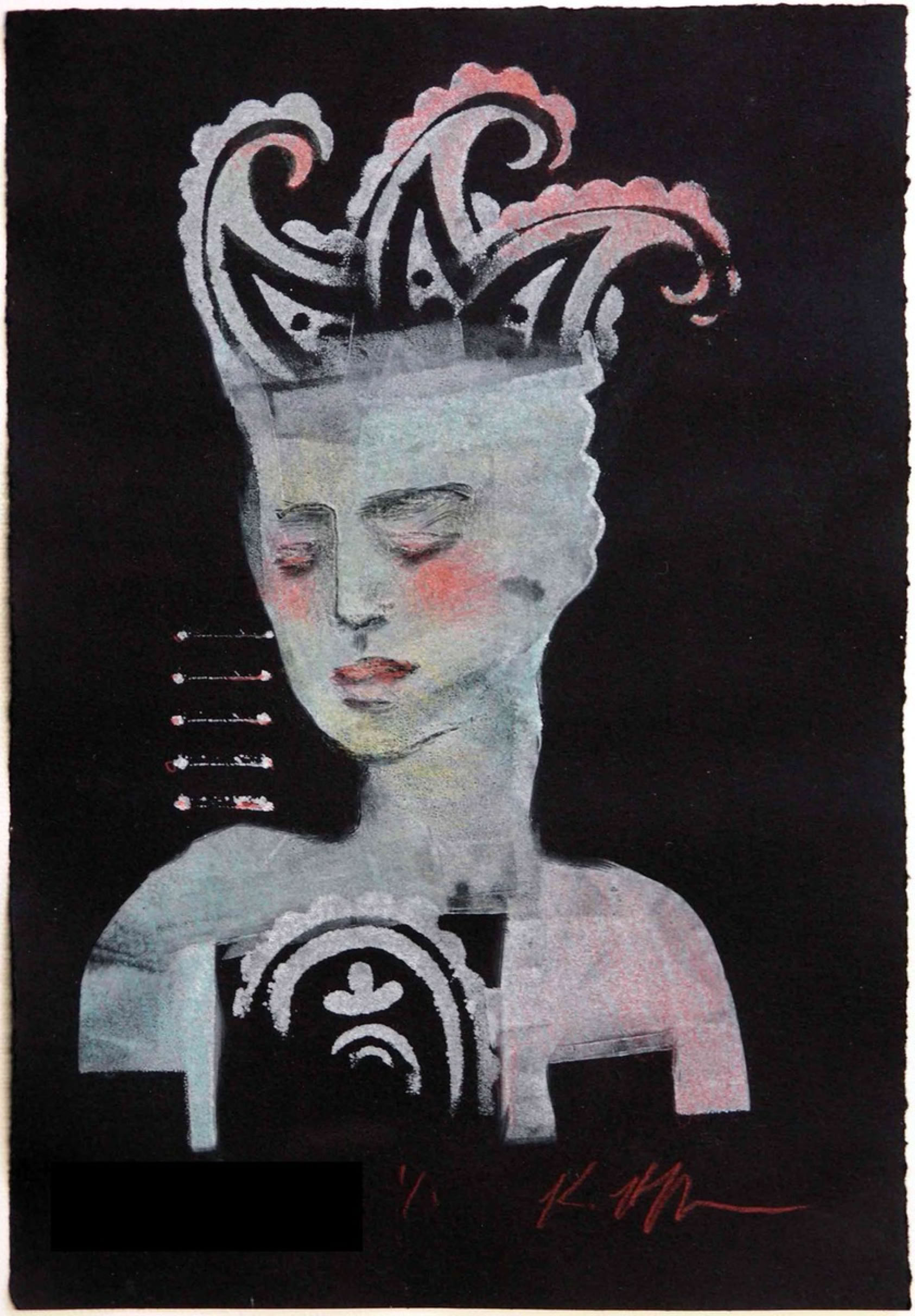 Monotype, white ink & colored pencil on black paper